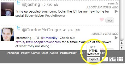 We added more sources to the PeopleBrowsr News section and we made many news keywords clickable. Click on the keywords to see the conversation going on about a specific subject and "move from formal news media sources to informal discussions"@tylergillies posted on our Google Group: "Would be cool if there was an rss feed associated with each poststack so we could share our groups with non twitter users".