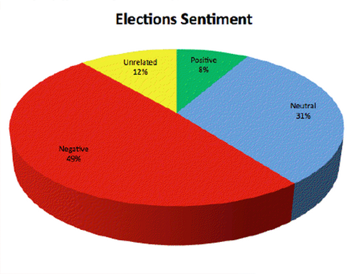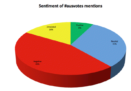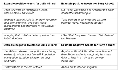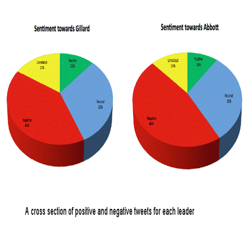 Most negative sentiment was about Abbott. Gillard and Abbott positive sentiment the same.Accurately gauging the sentiment of the electorate requires more modern techniques and technology than the two dimensional worm or Nielsen Polls.