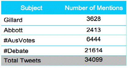 On debate night from 2pm to midnight, when Australia realised it was a school night and went to bed, there were 34,099 tweets about the debate with a frenzy of commenting during the closing statements of both leaders at 6:54 and 6:57pm.