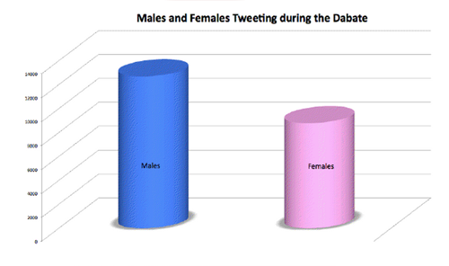 The Twitter skew was significantly male (M:F 13,868:9,302 or almost 3:2) for 2pm to midnight.