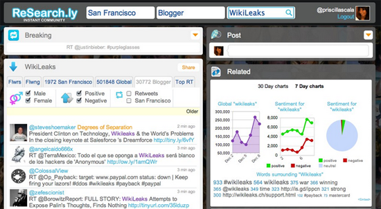 To begin a search on ReSearch.ly, enter keywords of interest — whether company name, brand or product name, competitor name or topic. ReSearch.ly first identifies people who are talking about a particular interest, and then instantly drills down to uncover rich data about the Social and Interest Graph, including location, sentiment, gender as well as related word clouds, hashtags, @Names, links. Overall, ReSearch.ly fires off 40 simultaneous searches for any topic and delivers the results almost instantly. This data gives brand managers and social media experts the ability to target specific market segments with unprecedented granularity and ease.