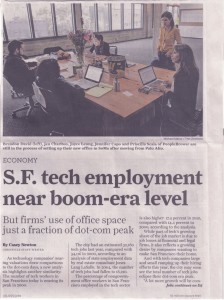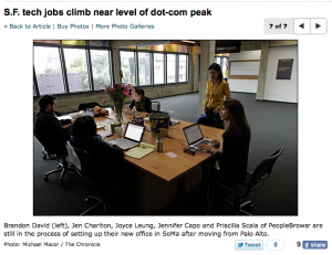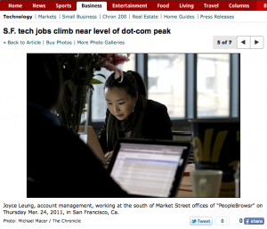 It's an exciting time to be in social media, especially in SoMa. Life on Bryant is going well for PeopleBrowsr and we were just featured on the front page of the Business Section in Sunday's San Francisco Chronicle! Thanks to @newtoncasey for this fantastic mention in a great article on tech's growing share of the job market, reasons companies are moving to San Francisco and the acceleration of the industry.