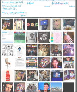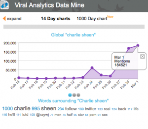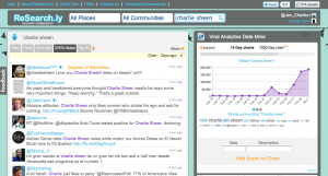 Using ReSearch.ly, see a live feed of Charlie Sheen mentions in real-time, with sentiment charts, viral analytics, related URLs and pics (I can haz meme?), RT acceleration and degrees of separation.